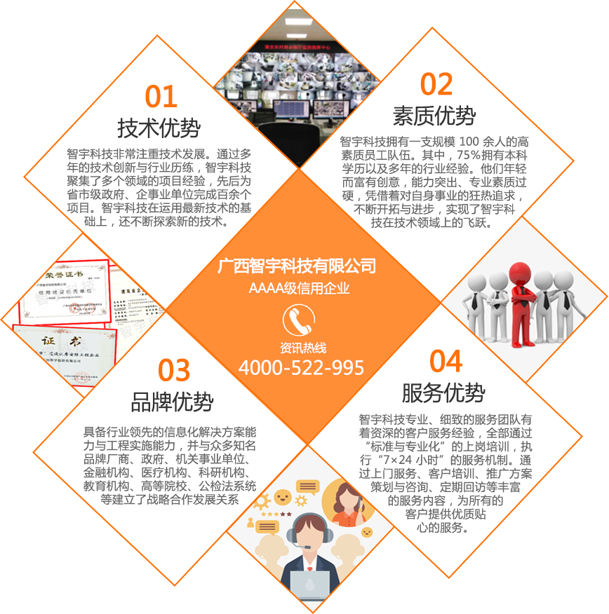 廣西智宇科技有限公司,自1995年成立以來(lái),已發(fā)展成為一家高新技術(shù)企業(yè),擁有多家分公司,遍布南寧、桂林、玉林、河池、扶綏、百色、欽州、防城港等地。憑借30年的專(zhuān)業(yè)經(jīng)驗(yàn)和技術(shù)儲(chǔ)備,智宇科技已成為一家行業(yè)領(lǐng)先的集團(tuán)企業(yè),致力于運(yùn)用前沿科技產(chǎn)品和技術(shù),為客戶(hù)提供高效服務(wù)。